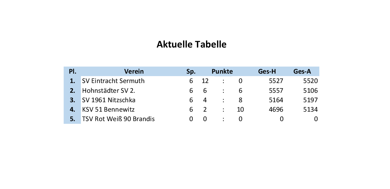 | 06.09.2025 | 10:00 | Bennewitz - Sermuth | 0 : 2 | 1465 : 1734 | |